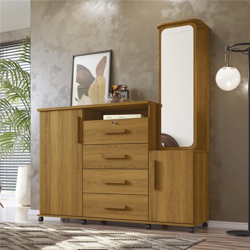 Pequenos espaços se tornam grandes ambientes com esse modelo. A Cômoda Copacabana tem espelho giratório, porta objetos, prateleira removível e muito espaço para você organizar.