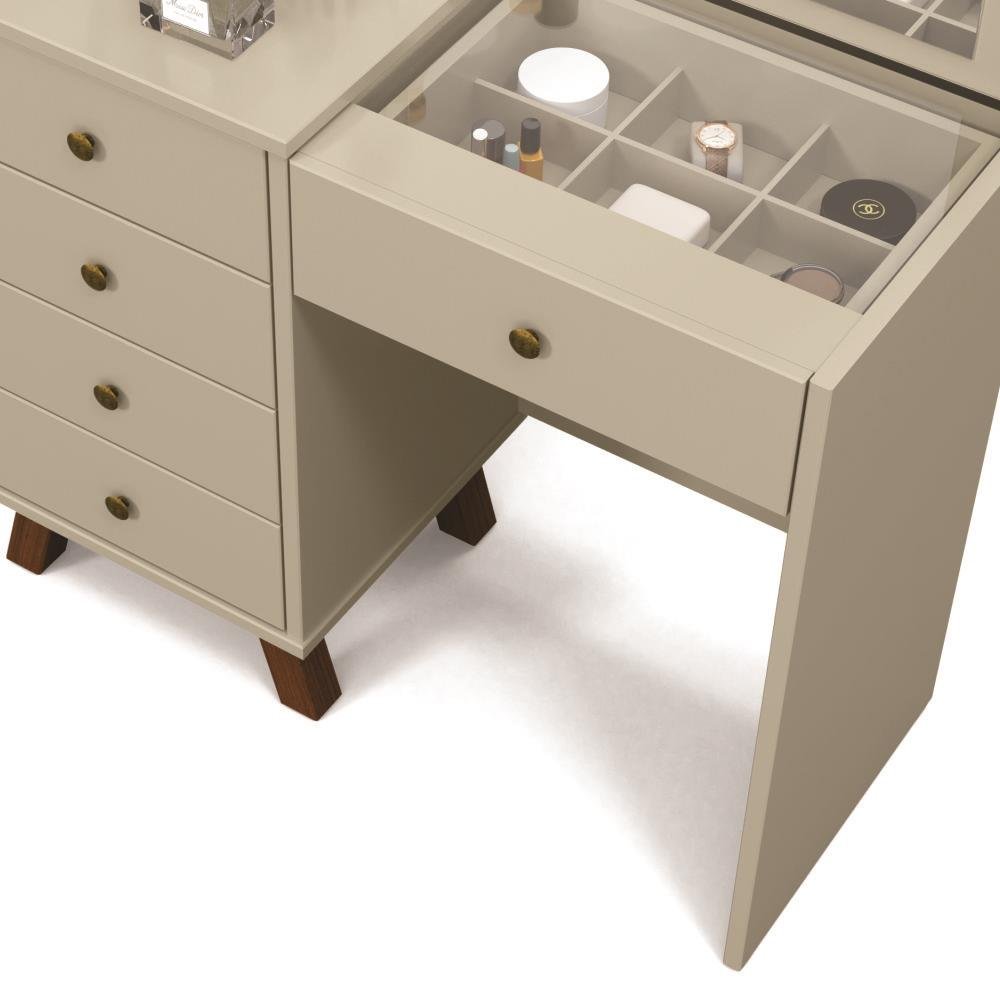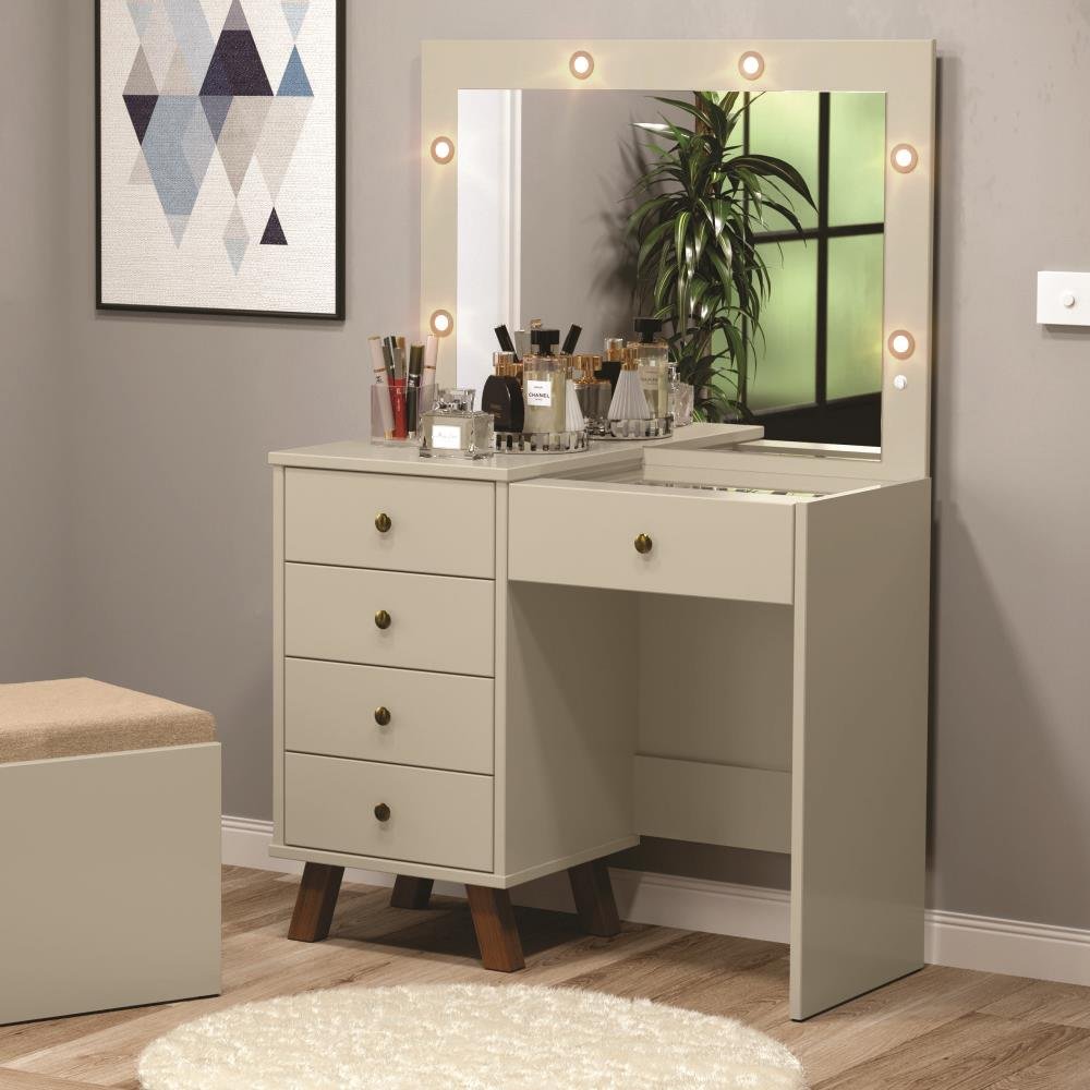 Com seu design elegante e funcional, esta penteadeira é mais do que um simples móvel; é o seu próprio camarim pessoal. Equipada com espelho amplo e iluminação de LED, a Penteadeira Camarim Mel oferece o ambiente perfeito para você se preparar com estilo e conforto. Seja para maquiagem, cuidados com a pele ou arrumação dos cabelos, esta peça vai transformar sua rotina de beleza em um momento de glamour. Desfrute da elegância e praticidade da Penteadeira e eleve sua experiência de beleza a um novo patamar.